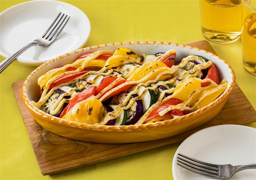 ズッキーニ、なす、パプリカの彩り野菜に、アイオリマヨをかけてこんがりと焼きました。じっくりと焼いて引き出した野菜の甘みに、にんにくの風味が効いたアイオリマヨがよく合います。