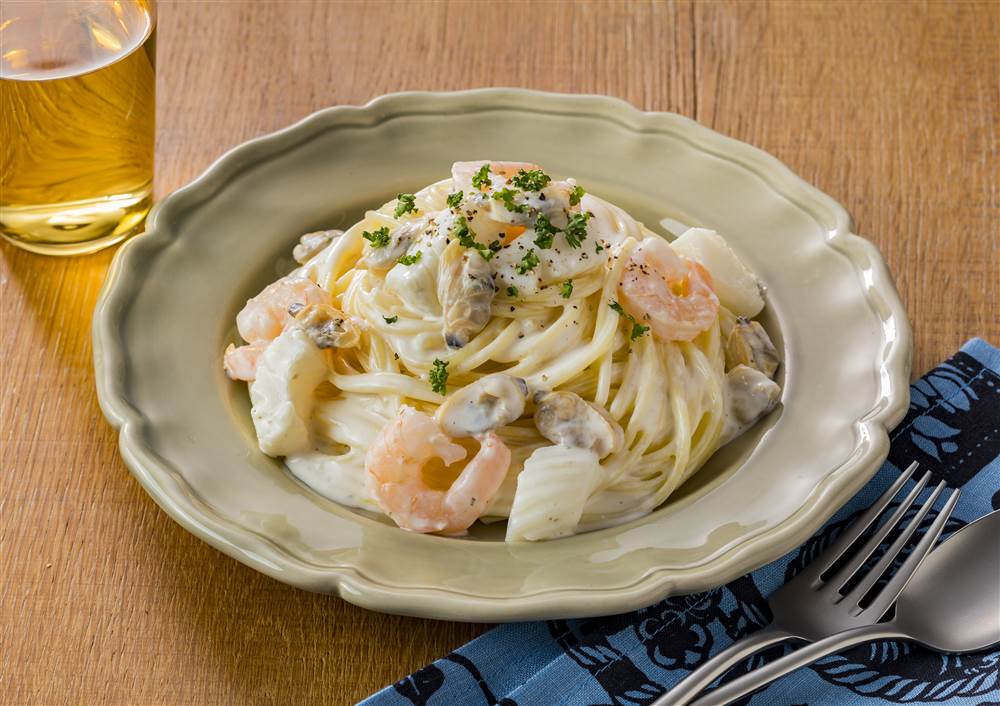 アイオリマヨと牛乳を使えば、かんたんにクリームパスタが作れます。にんにくの風味が効いたクリームソースが、シーフードのうま味と絶妙に合います。