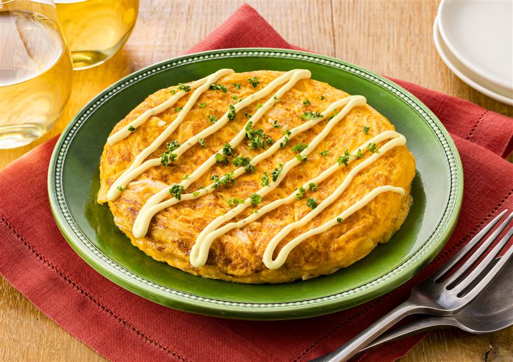 細切りにしたじゃがいもと薄切りにした玉ねぎを炒めて、たっぷりの卵を加えて焼いた、ボリュームのあるオープンオムレツです。アイオリマヨのにんにくの風味がよく合います。