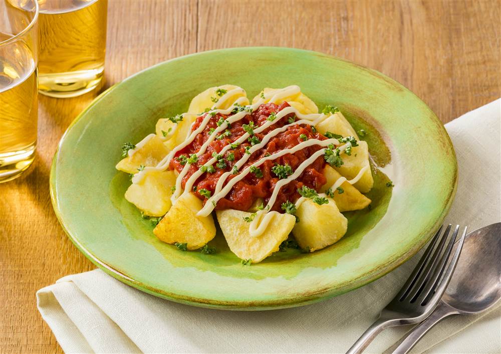 パタタス・ブラバスは素揚げしたじゃがいもにピリ辛トマトソースをかけたスペイン・バルセロナの名物料理です。ピリ辛のトマトソースににんにくの風味がきいたアイオリマヨがよく合います。