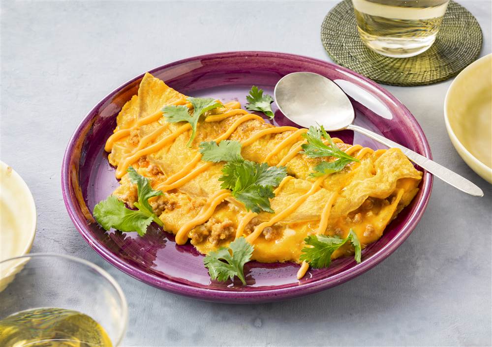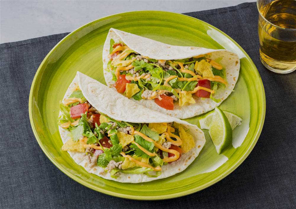 サクサクのトルティーヤチップスと豚ひき肉に、シラチャーマヨのピリ辛なアクセントが加わったスパイシータコスです。仕上げにライムをしぼれば、さっぱりとした風味が引き立ちます。