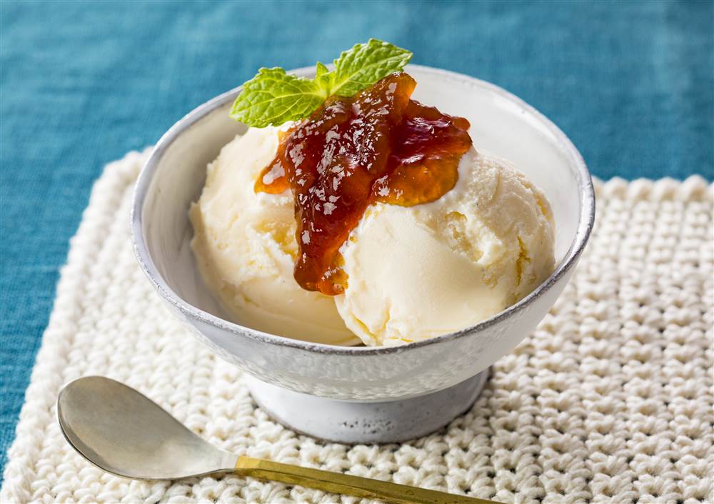 1器にバニラアイスクリームを入れ、ジャムをのせ、ミントを添える。