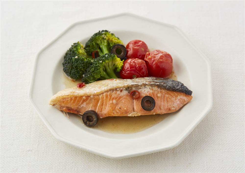 鮭とブロッコリーの蒸し焼き ガーリックソース