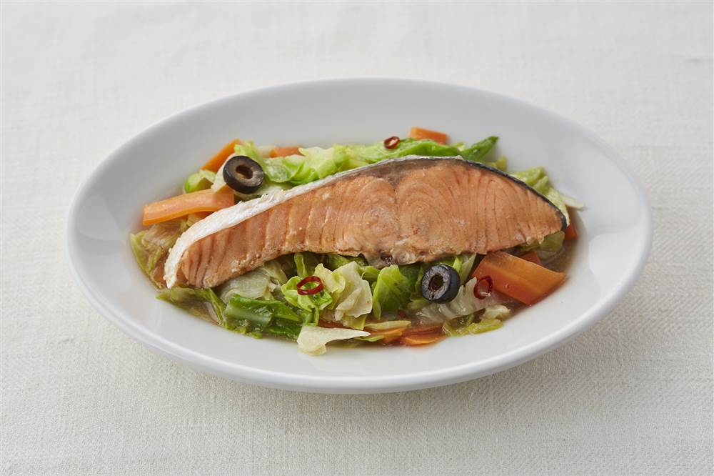 鮭と春キャベツの蒸し焼き ガーリックソース