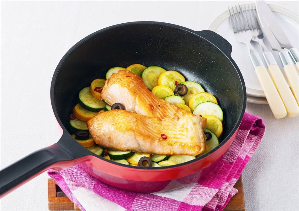 フライパンひとつで、鮭と野菜を使ったメインのおかずができます。3種のハーブの香りとソテーしたガーリックのうま味が魚介と野菜を引き立てます。