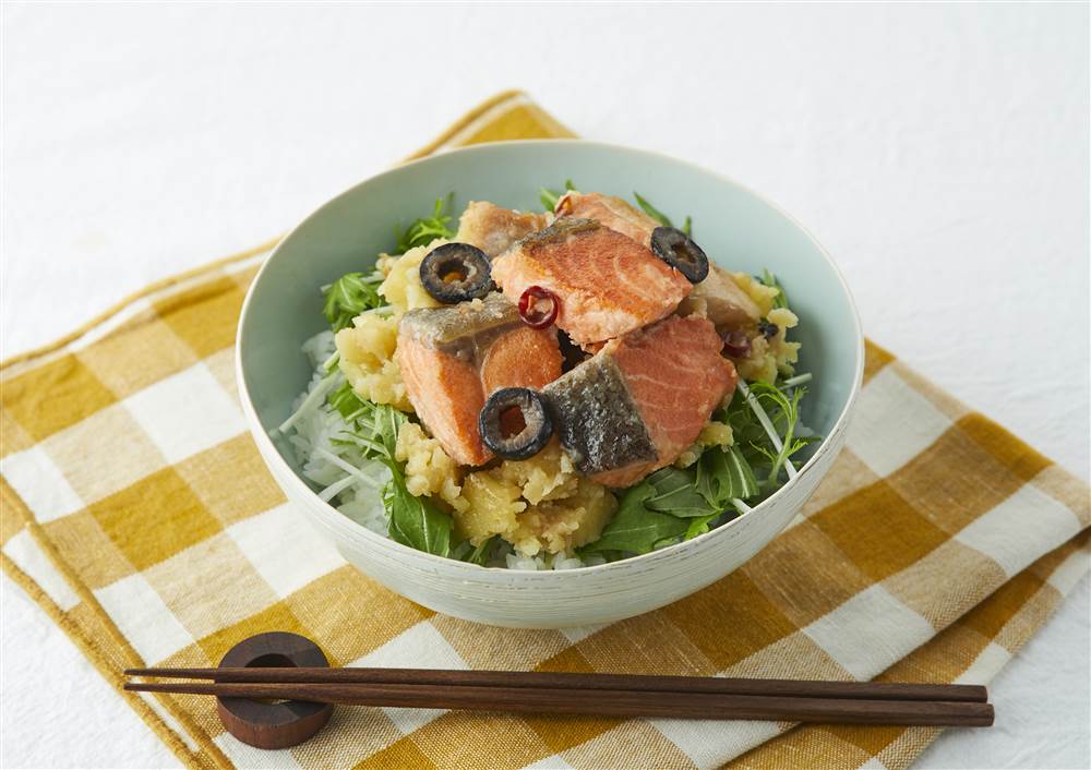鮭をほぐしながら、ガーリックソースがしみ込んだじゃがいもと一緒に食べる、ボリューム満点の丼です。