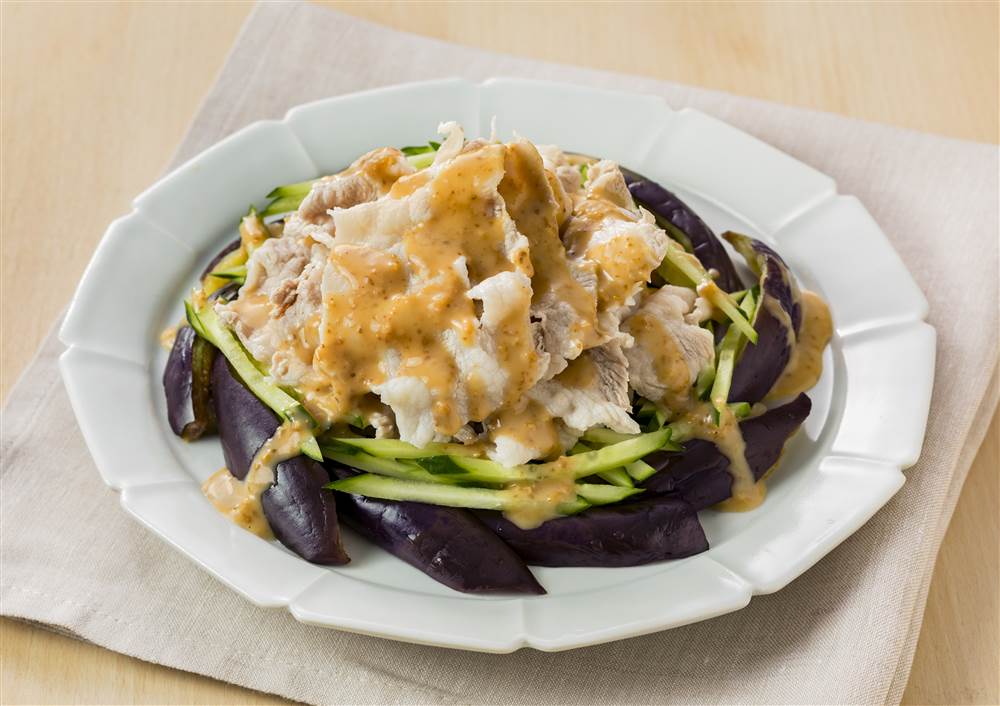 まるごとレンジ加熱して色鮮やかに仕上げたなすと、相性抜群の豚しゃぶに、薬味や柑橘の味わいを加えさっぱりと仕上げた深煎りごまドレッシングがよく合います。シャキシャキしたきゅうりの食感がアクセントです。