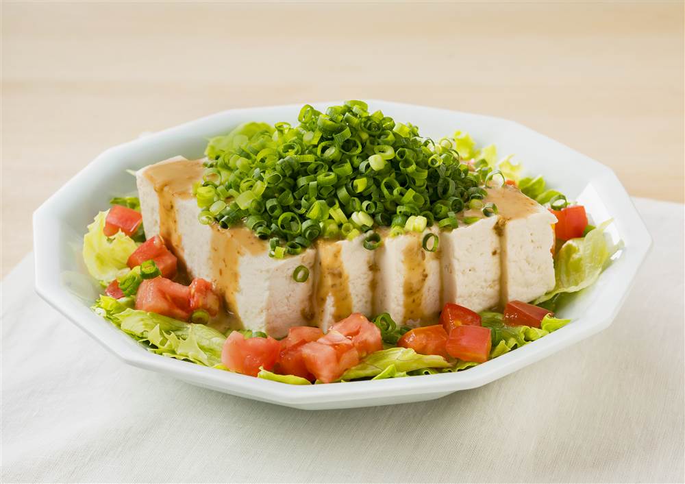 たっぷりの小ねぎをのせた豆腐に、薬味や柑橘の味わいを加えさっぱりと仕上げた深煎りごまドレッシングがよく合います。