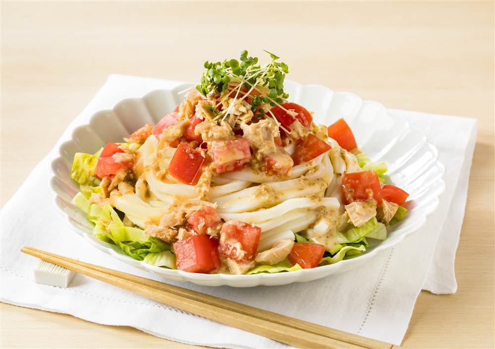 ツナとうどんに、深く煎ったすりたてごまの香り豊かなドレッシングがよく合います。薬味や柑橘の味わいでさっぱりと召しあがれる、彩のきれいな一品です。