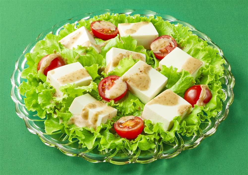 みずみずしいレタスとまろやかな豆腐に、濃厚なごまドレッシングがよく合います。薬味や柑橘の味わいでさっぱりと召しあがれます。