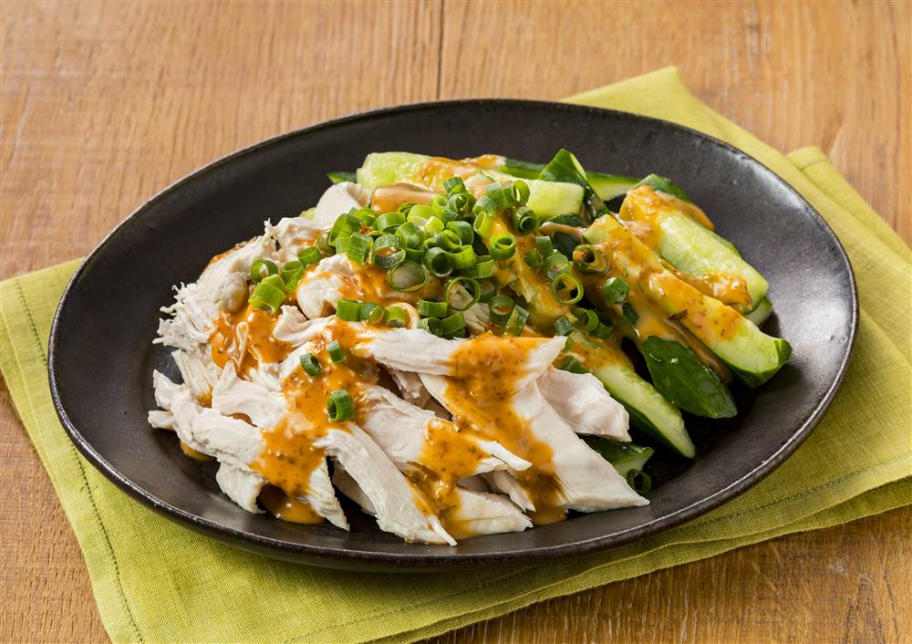 蒸し鶏ときゅうりが、すりたての胡麻のまろやかなコクに、ピリ辛のラー油を効かせたドレッシングによく合います。たたききゅうりのシャキシャキとした食感がアクセントです。