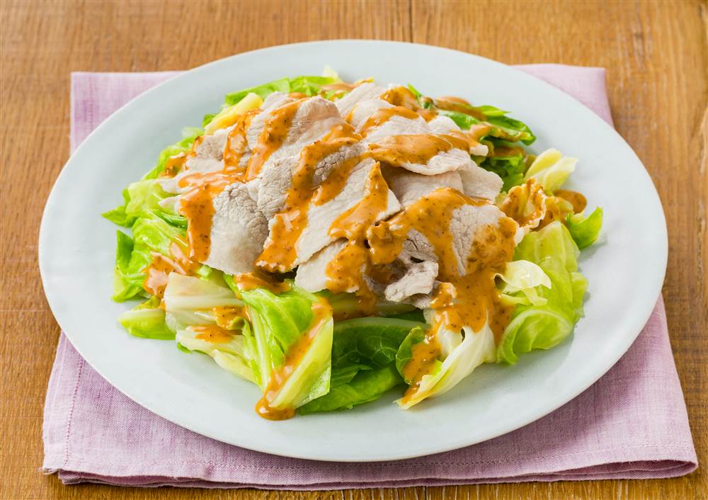 すりたての胡麻のまろやかなコクにラー油を効かせたドレッシングに、さっぱりとしたゆで豚とキャベツがよく合います。さっとゆでてドレッシングをかけるだけの、かんたんな一品です。