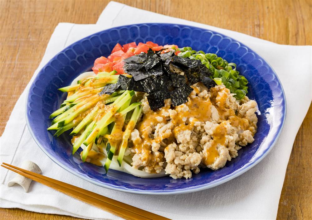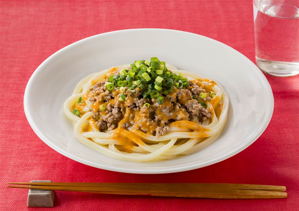 ひき肉を炒めてうどんにのせ、ドレッシングをかけるだけのかんたんメニューです。ラー油の辛味とにんにくのうま味でコク深く仕上げた深煎りごまドレッシングがよく合います。