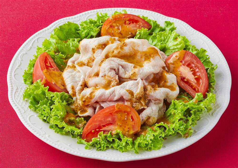 ラー油の辛味とにんにくのうま味でコク深く仕上げた深煎りごまドレッシングが、豚しゃぶによく合います。