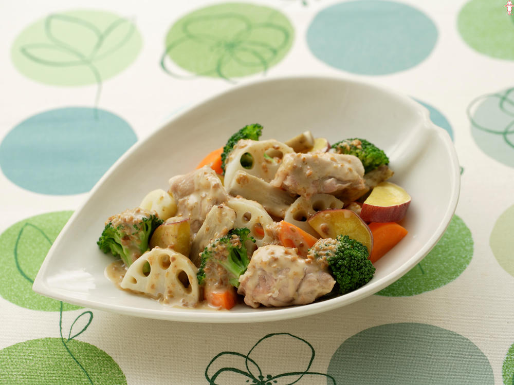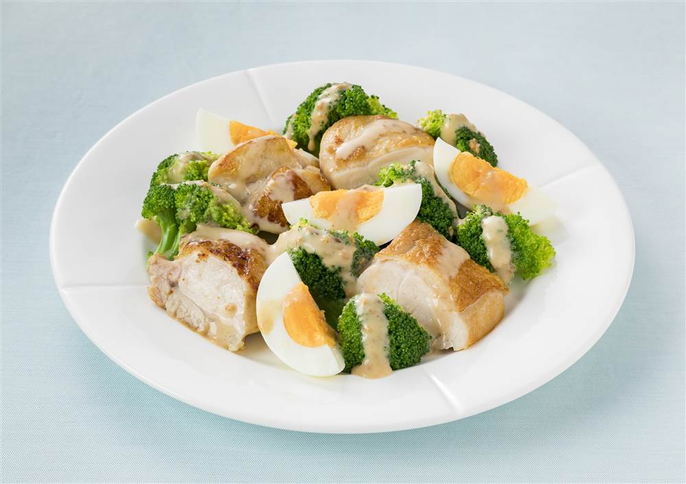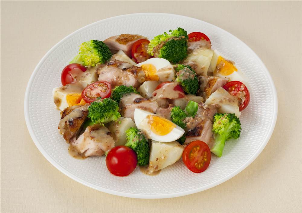 粒ごまの香ばしさとピーナッツのコクで味わい深く仕上げたドレッシングが、焼いた鶏もも肉やブロッコリーによく合います。シンプルな素材の組み合わせにドレッシングをかけるだけで、かんたんにごちそう感のあるサラダになります。