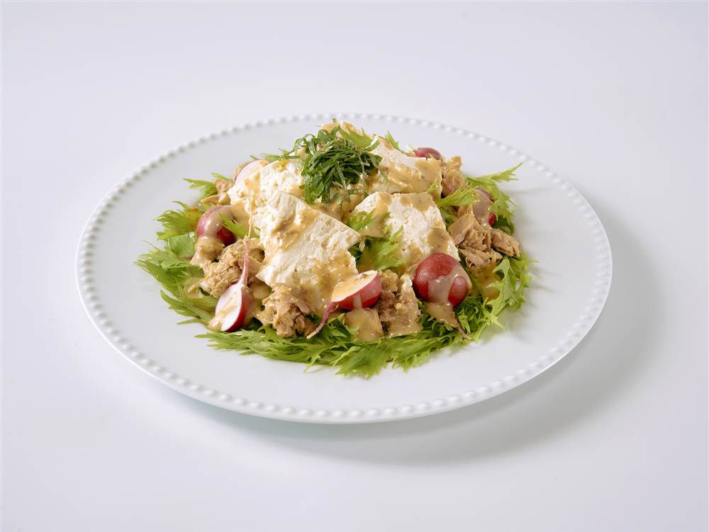 まろやかな豆腐に濃厚なごまドレッシングがよく合います。青じその香りがアクセントの、見た目も食感もたのしめるサラダです。