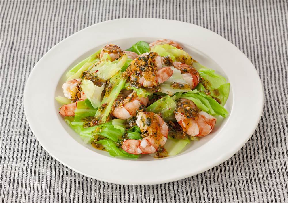 えびとキャベツをレンジ加熱して、さくさくの香ばしガーリックとオリーブオイルの風味をいかしたソースをかけるだけ。ガーリックの食感と香りをおたのしみいただけます。