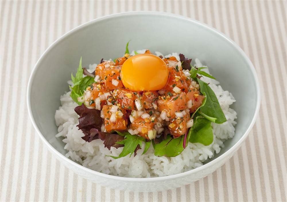 サーモンとシャキシャキの玉ねぎに、さくさくの香ばしガーリックとオリーブオイルの風味のソースがよく合います。食感と香りがたのしめ、見た目にも食欲をそそる一品です。