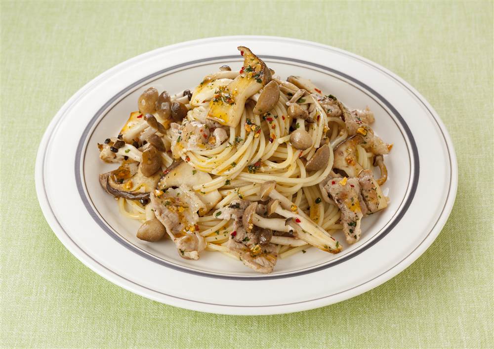 きのこと豚肉に、さくさくの香ばしガーリックとオリーブオイルの風味をいかしたソースがよく合います。