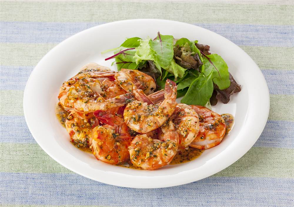 炒めたえびに、ガーリックソースをからめるだけで、かんたんにガーリックシュリンプができます。さくさくの香ばしガーリックとオリーブオイルの風味をいかしたソースが、えびによく合います。