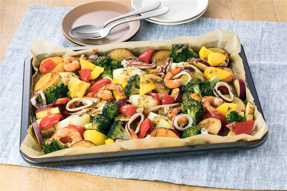 えびといかにいろいろな野菜を合わせて天板にぎっしりつめて、じっくりとオーブンで焼きました。サクサクとした食感のガーリックソースがよく合います。