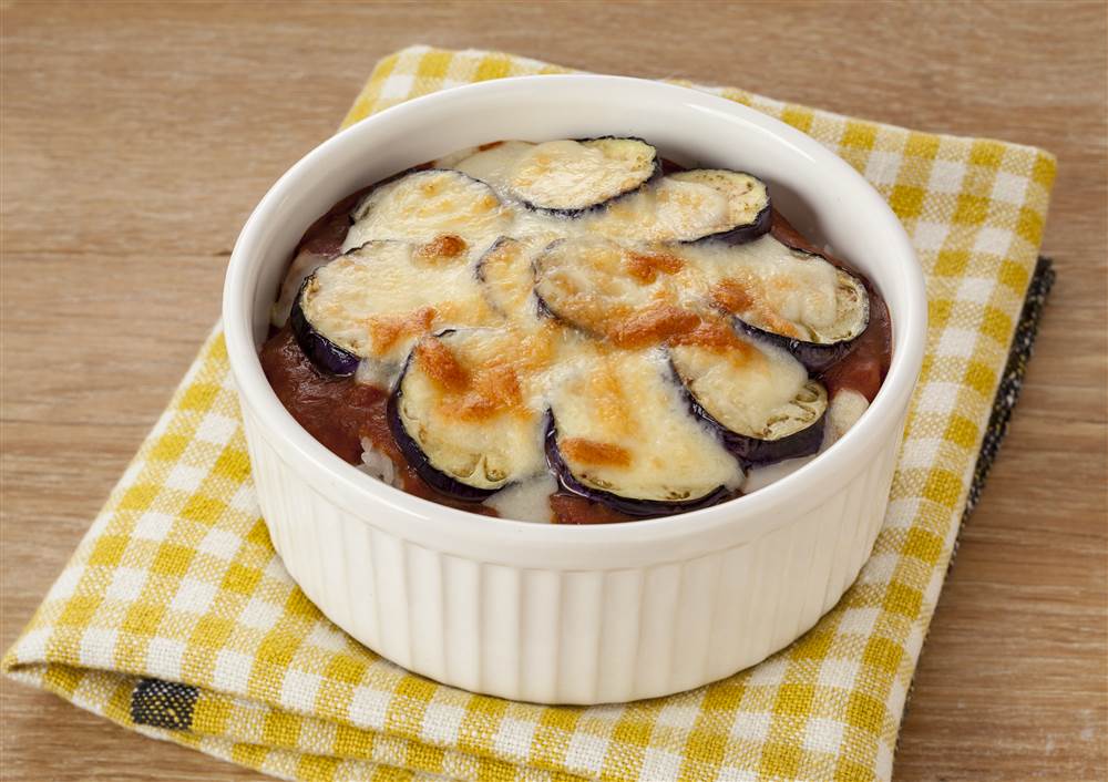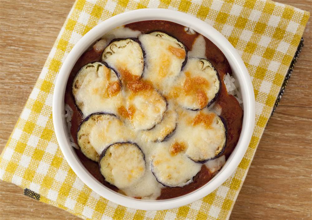 ミートソースをかけるだけで、かんたんに味が決まるドリアです。炒めたなすととろけるチーズにミートソースがよく合います。ランチにもおすすめします。