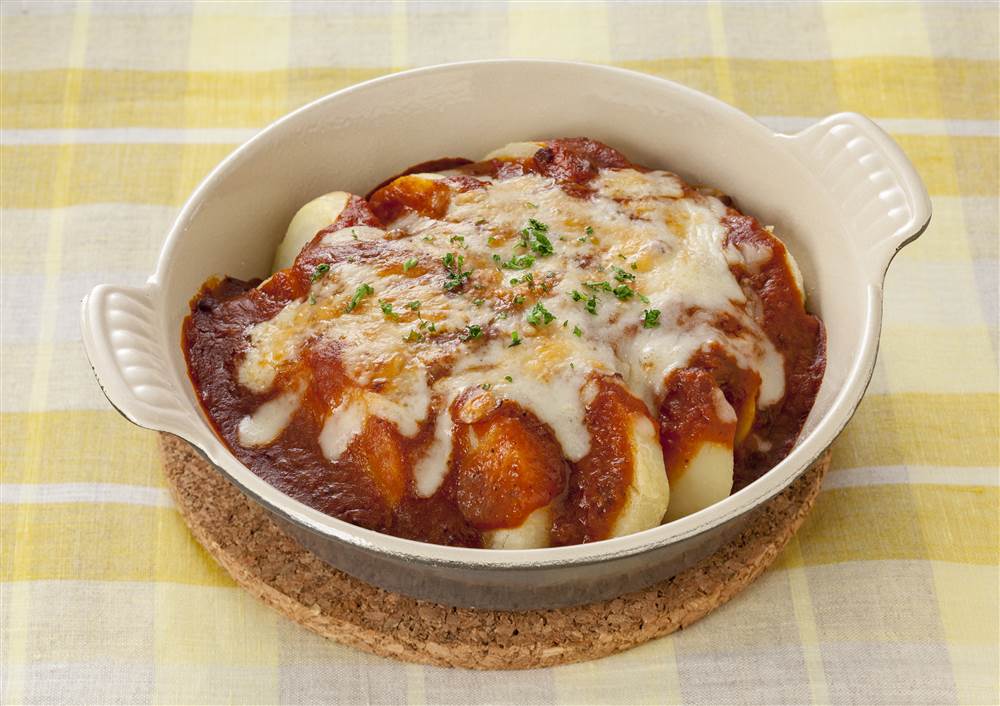 レンジ加熱したじゃがいもに、肉のうま味が引き立つ濃厚なミートソースをかけただけでできるグラタンです。じっくり煮込んだドミグラスソースとフォン・ド・ヴォーのコクが味わえます。