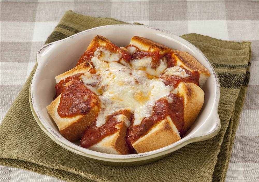 2耐熱容器に①を並べ、ミートソースとピザ用チーズをかける。