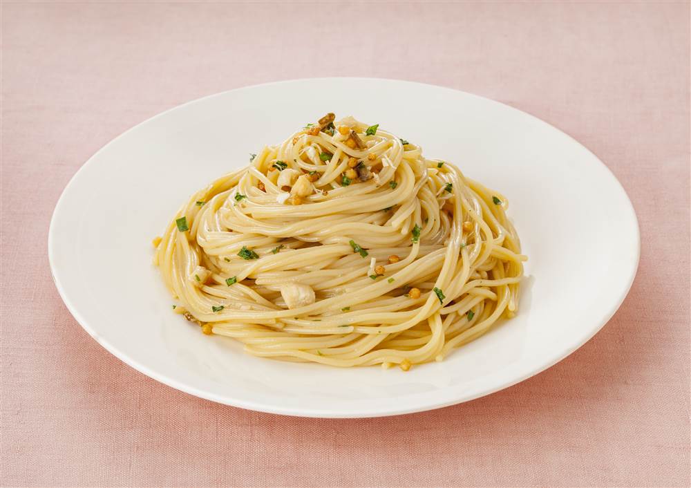 ゆでたパスタにそのままあえるだけ! 風味豊かなバター醤油に、貝柱のうま味とローストごぼうの甘みをきかせた香ばしい和風ソースのスパゲッティです。