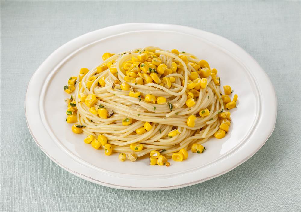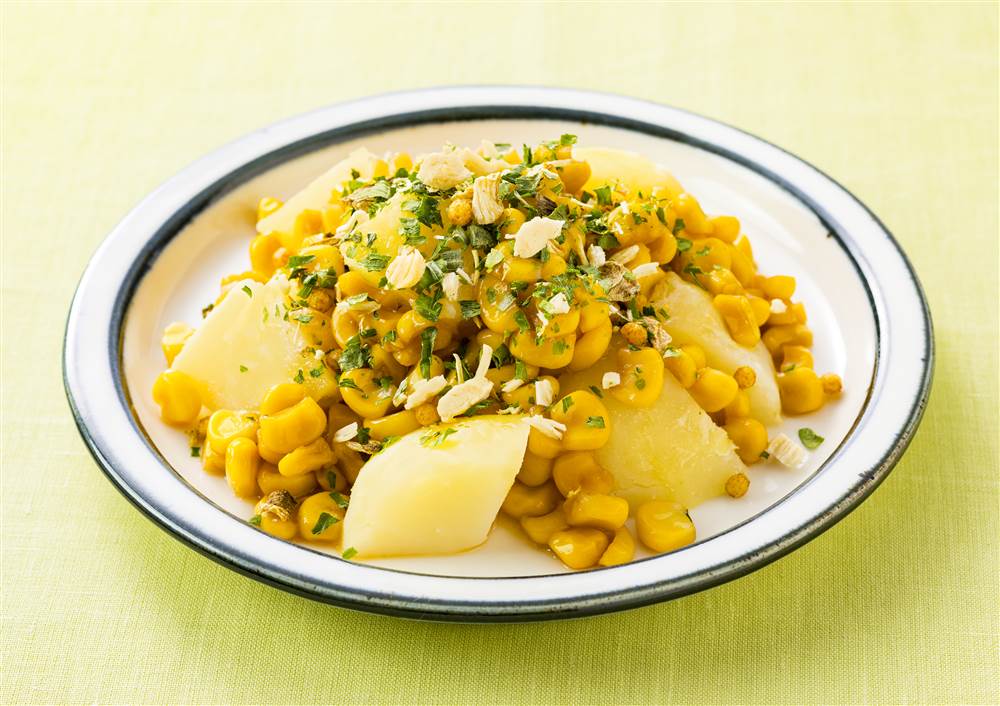ホクホクのじゃがいもに、香ばしいバター醤油のパスタソースで炒めたコーンをたっぷりとのせました。