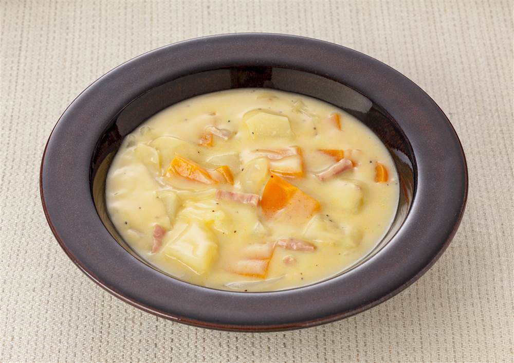 カルボナーラソースをかけてレンジ加熱するだけでかんたんにできるシチューです。濃厚なチーズと卵黄のコクが引き立つクリーミィな味わいの一品です。