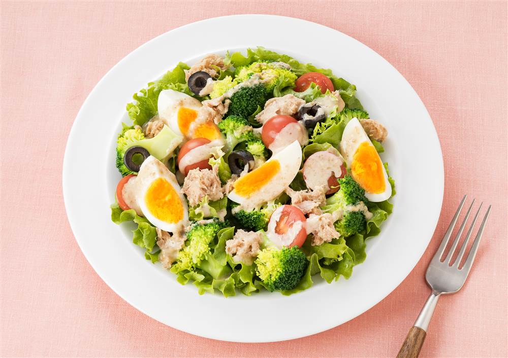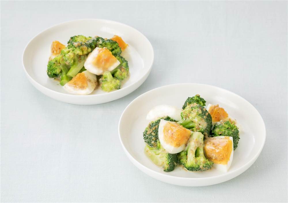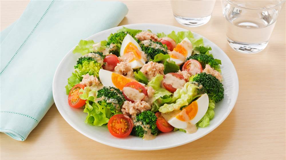 ドレッシングの深く煎ったごまの風味が、ゆで卵と野菜によく合います。ミニトマトで彩りを加えました。
