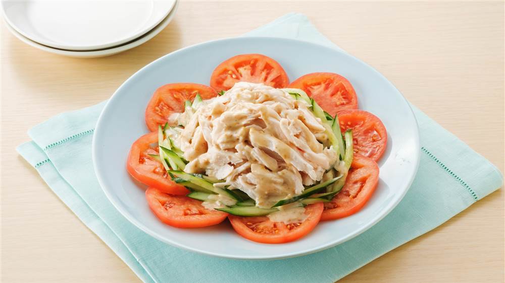 淡白な鶏むね肉にごまドレッシングのコク深い味わいがよく合います。みずみずしいきゅうりとトマトをあわせて、バンバンジー風に仕上げました。