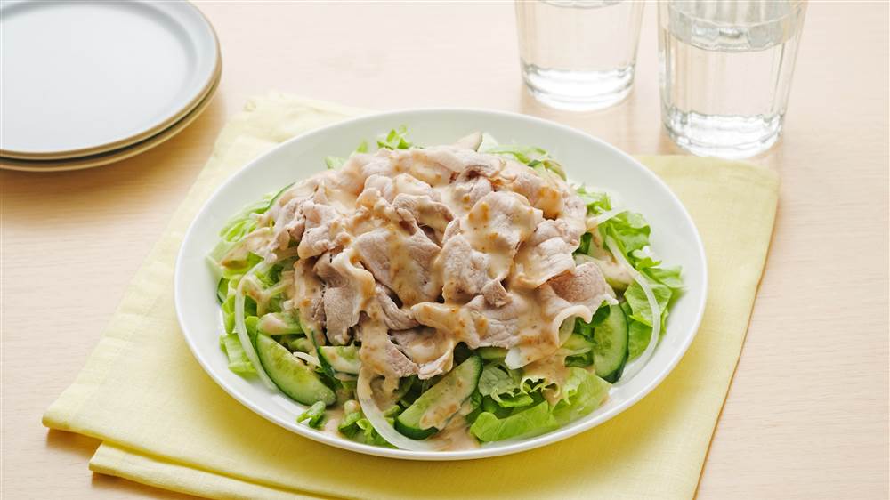 豚しゃぶと相性のよいごまドレッシングのコク深い味わいが食欲をそそります。野菜もたっぷりいただけて、満足感のあるサラダです。