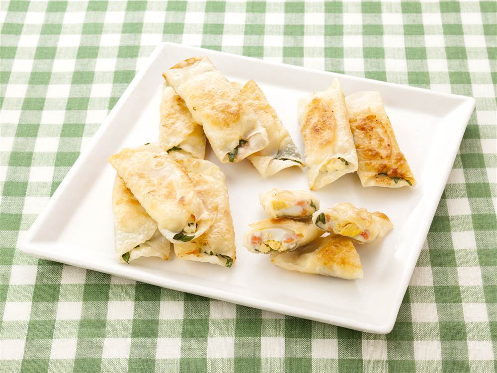 ぎょうざの皮でポテトサラダを包んだ、包み焼きです。青じその風味がアクセントになっています。おつまみはもちろん、お子様にもおすすめです。