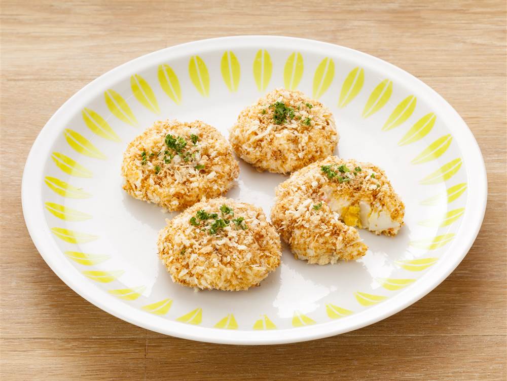ゆで卵のコクが加わったポテトサラダがサクサクのパン粉とよく合う一品です。小さく丸めるとお弁当にもおすすめです。
