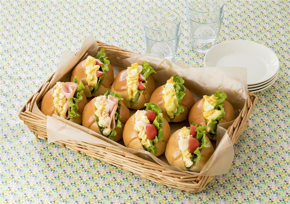 ③の2個に、たまごサラダを1/4量ずつ入れてはさむ。