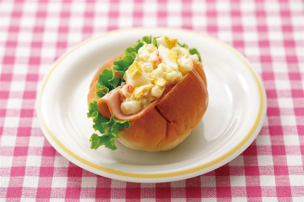 たまごポテトサラダとハムのロールパンサンド