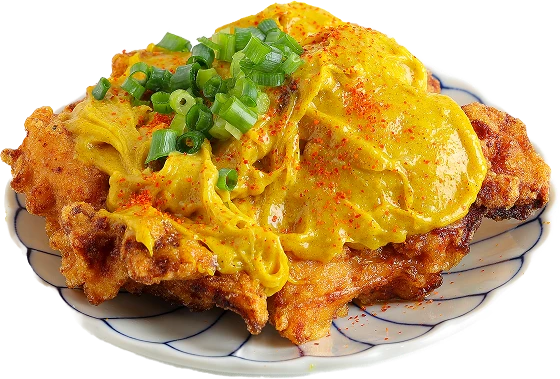 外国人の注文が多いフライドチキンに日本らしさを加えるために考案しました。酸味と発酵風味が強いため、2種の醤でまろやかさを加え、練乳で酸味を抑えています。チキンはカレー粉と牛だしで衣に味をつけ、高菜マヨで味変する、二重の仕掛けを盛り込んでいます。