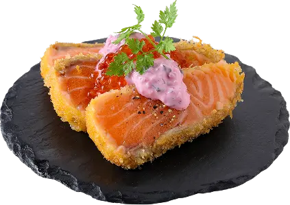 サーモンのオレンジにピンクのソースを重ねるため、色が出やすいマヨネーズをソースの土台に採用。赤紫蘇ふりかけを混ぜてひと晩寝かせることで色を移している。「カツとソースを必ず一緒に食べていただきたいので断面にのせるスタイルにしました」(飯山氏)。