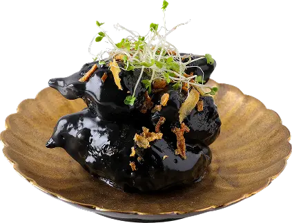 マヨネーズは色がつきやすいので、いっそ真っ黒にしようとイカスミを混ぜました。マヨネーズの油分でイカスミがきれいに馴染み、独特のツヤが出ました。カニ味噌で甲殻類の旨みを足したことで、ベースのエビフリット自体がおいしく感じられます。
