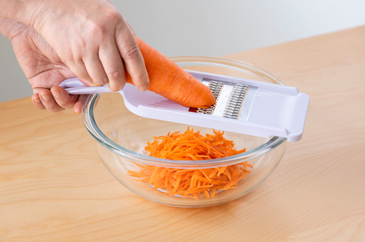 にんじんをスライサーでせん切りにする。