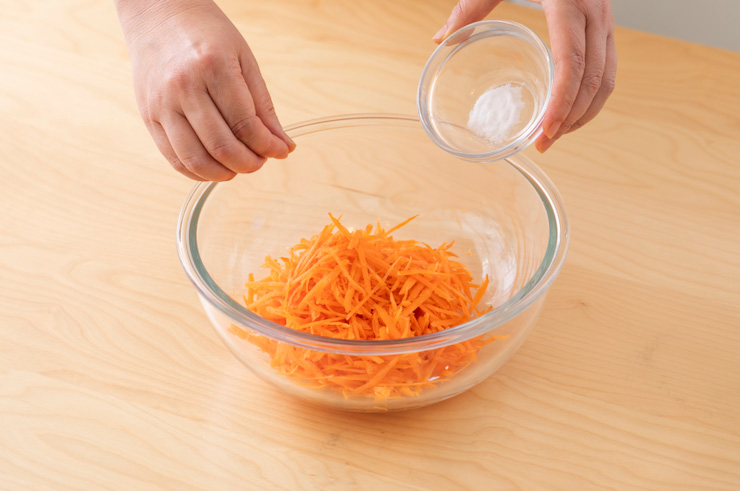 せん切りにしたにんじんに塩をふり、全体を軽く混ぜる。約10分置く。