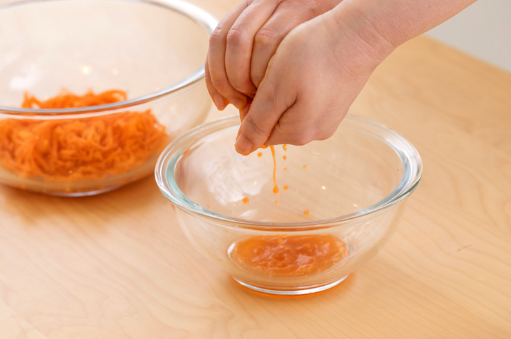 2のにんじんをしっかりと両手でしぼり、水気をきる。