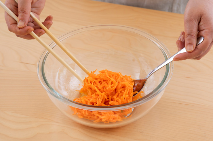 3のボウルに、水気をきったにんじんを入れ、全体がしっかりと混ざるようにあえる。