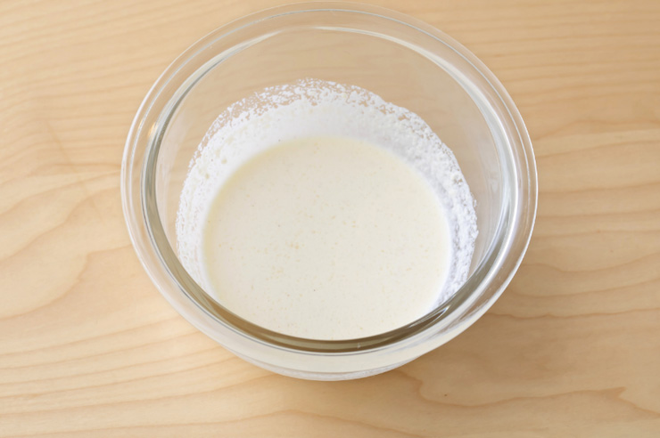 マヨネーズと粉チーズ、塩、黒こしょうをボウルに入れ混ぜる。牛乳を少しずつ加えながら混ぜる。