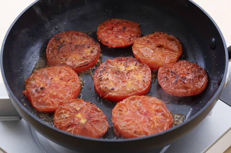フライパンにオリーブオイルを入れて熱し、トマトの両面に焼き色がつくまで中火でこんがりと焼く。