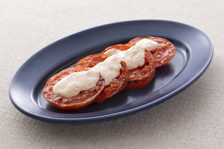 フライパンでステーキのようにトマトを焼いた、生トマトとは違ったサラダです。トマトを加熱することでうま味が増え食感が柔らかくなります。チーズ味のドレッシングでピザのような味わいなので、温かいうちに召しあがってください。