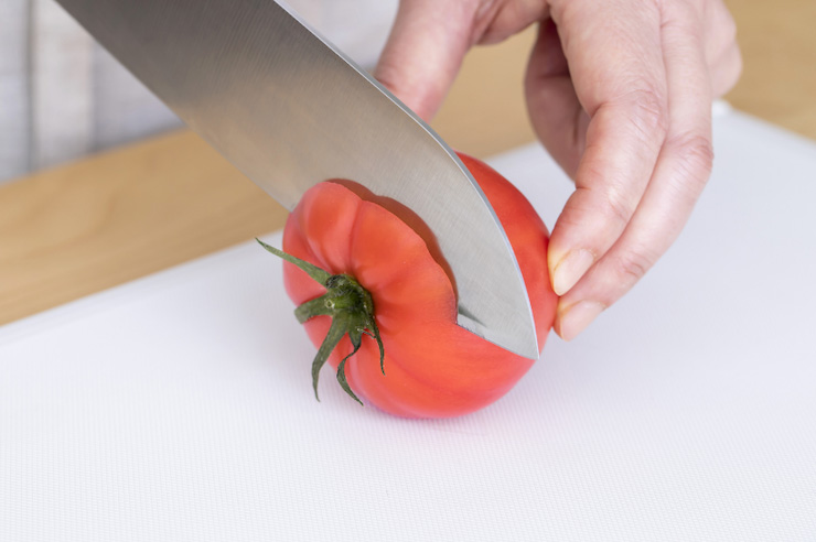 トマトのヘタ部分を横にしてまな板におき、ヘタから約1cm程厚さをとって切り取る。
