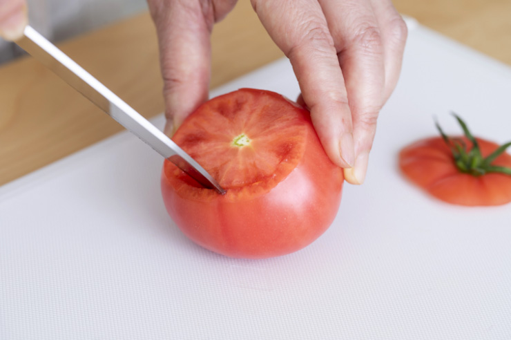 包丁の先でトマトの中に切り込みを入れ、中身をスプーンでくり抜く。